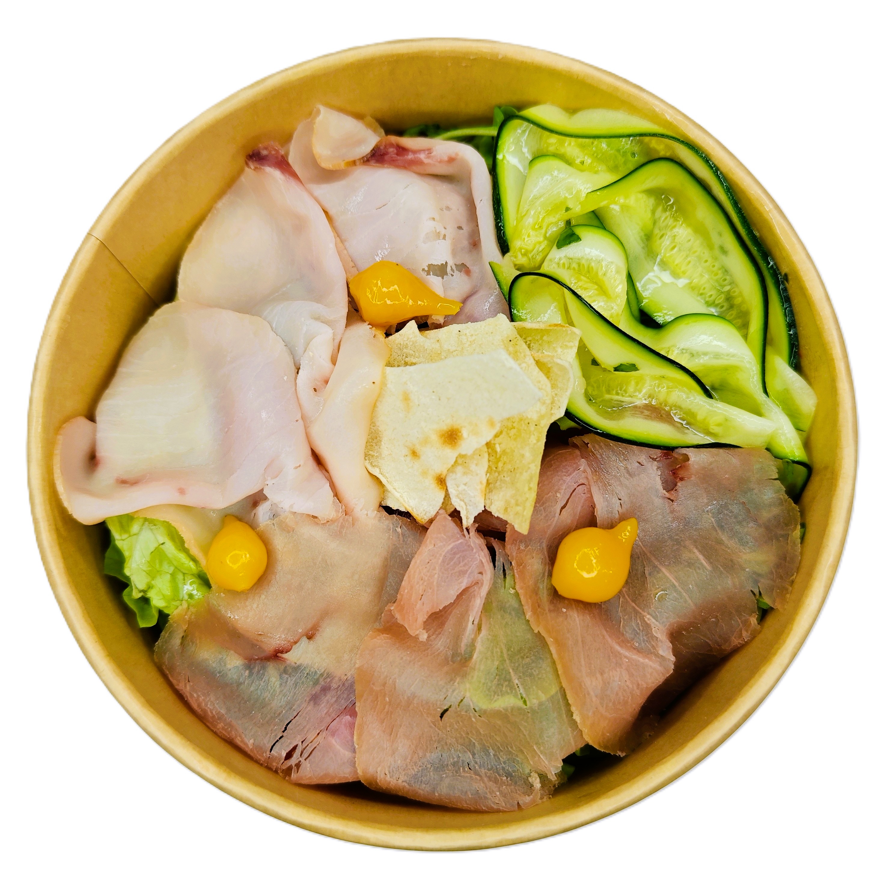 Insalata, Rucola, Pomodorini, Pesce Spada, Tonno, Zucchine marinati, Gocce di peperone.
