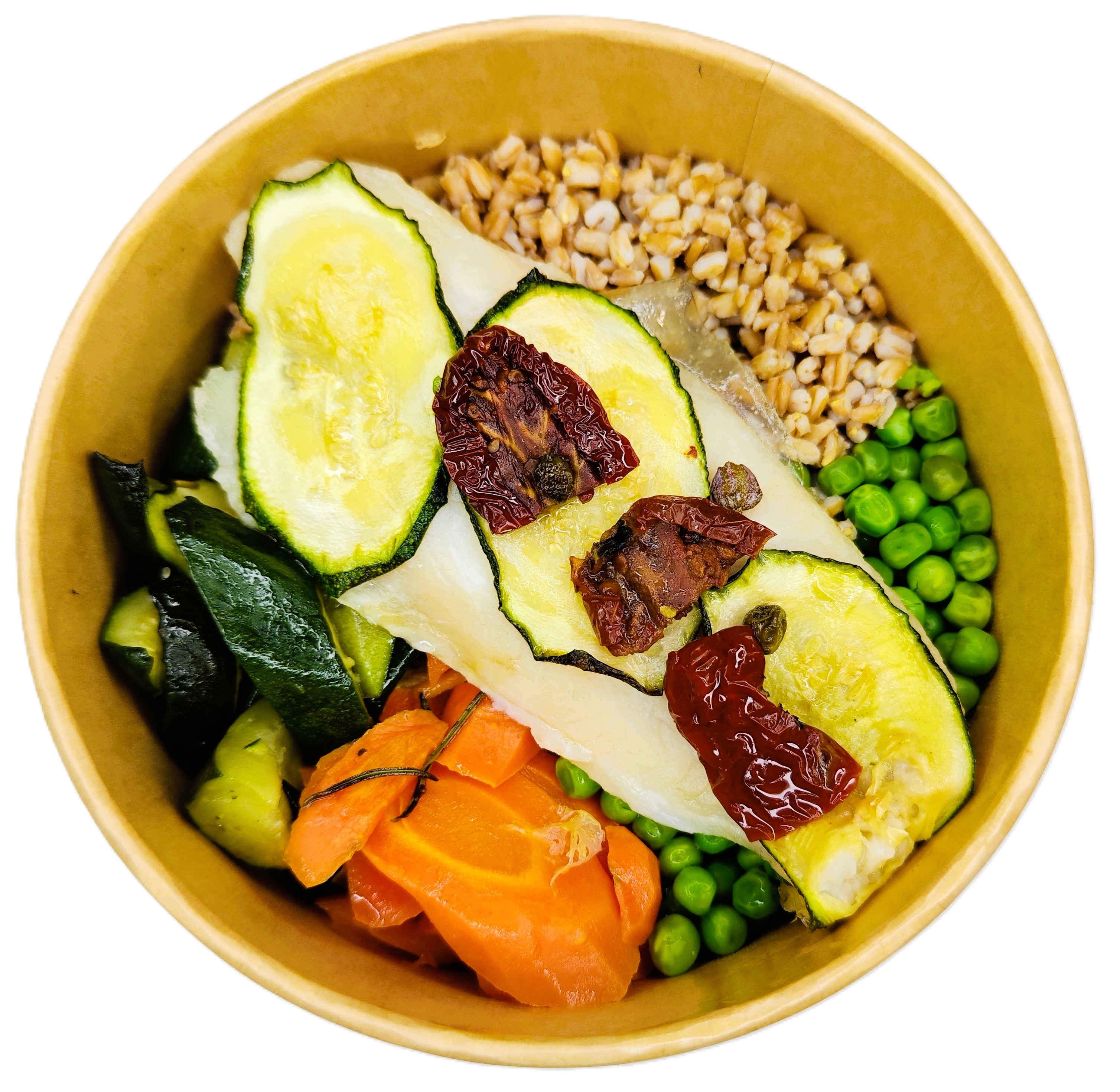 Farro, zucchine, pomodori secchi, pangasio, piselli , carote, capperi.