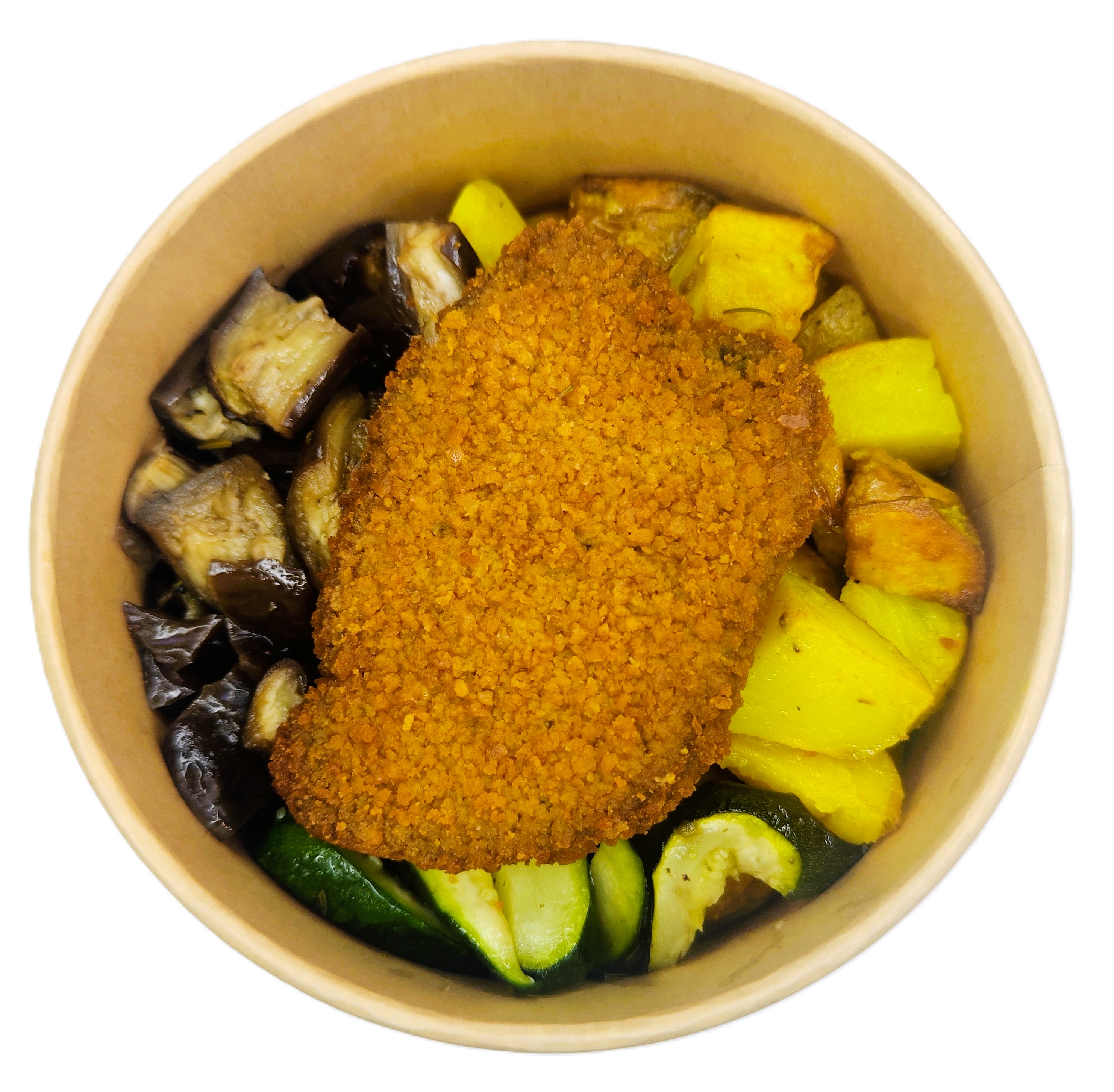 Pollo petto, pangrattato, patate, melanzane, zucchine.