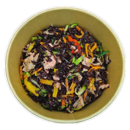 Riso Venere, porro, zucchine, carote, piselli e salmone affumicato