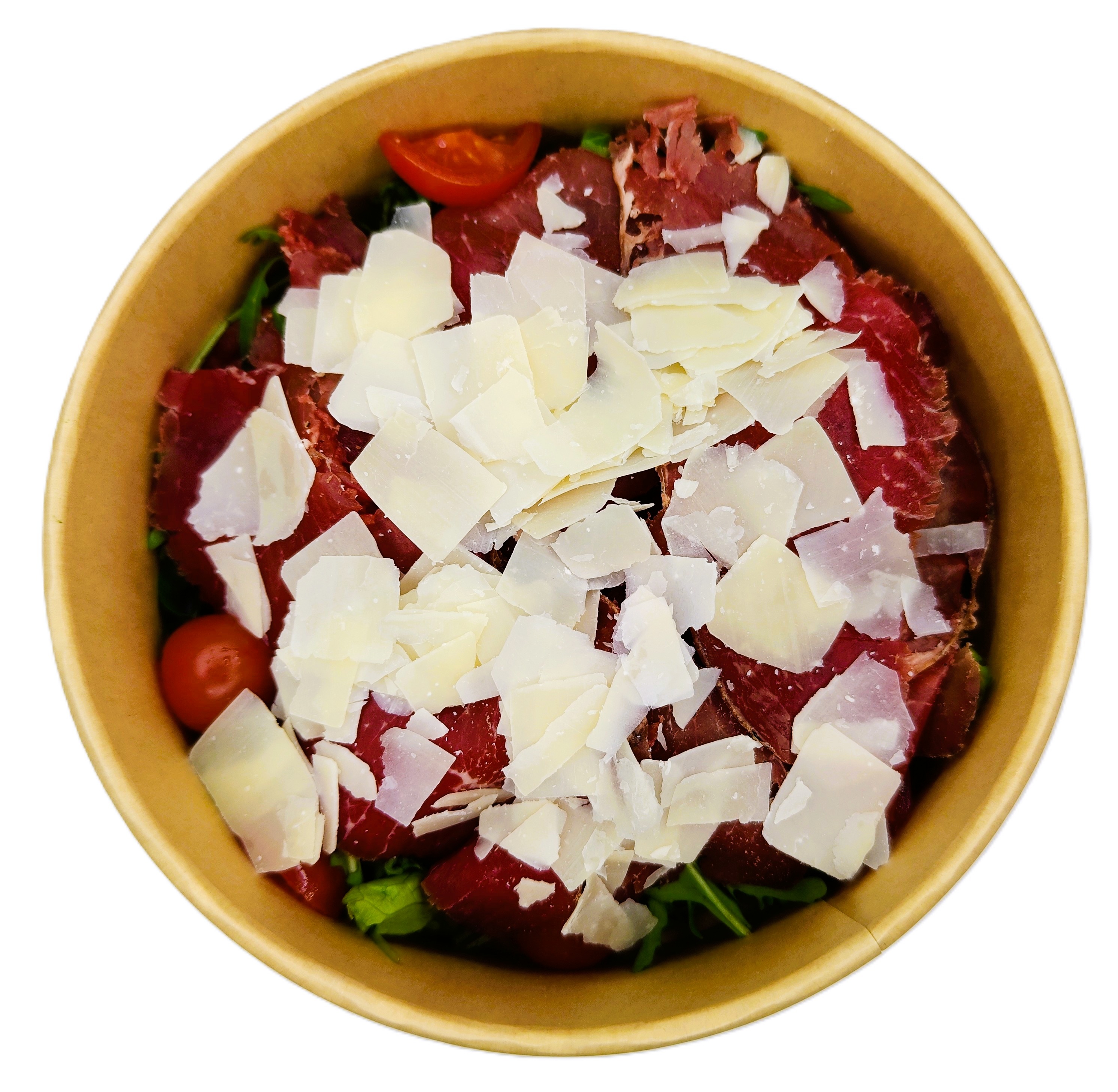 Scottona di manzo, rucola, scaglie di grana, pomodorini, glassa di balsamico