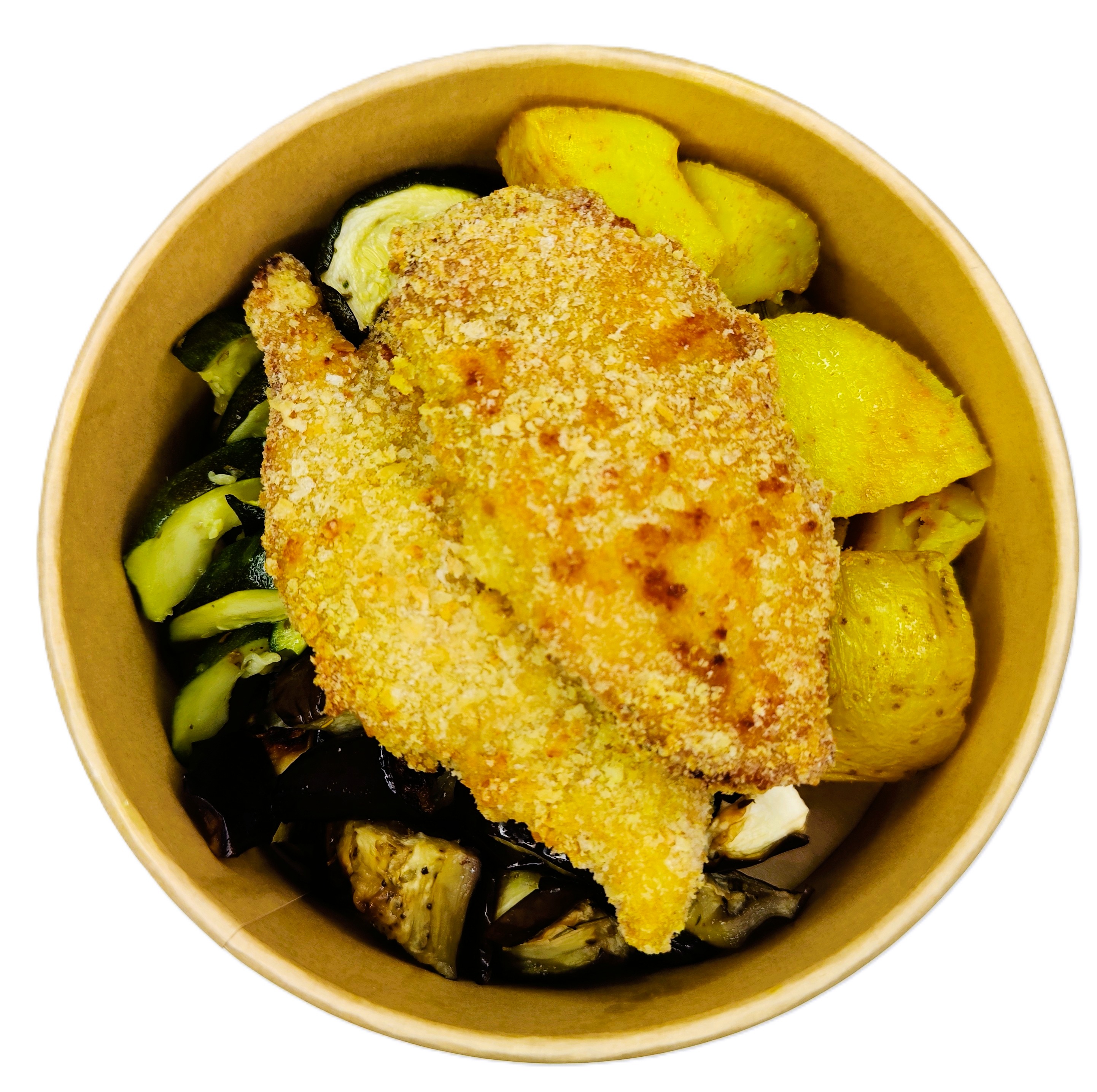 Pollo petto, pangrattato, latte, paprika, patate, melanzane, zucchine.