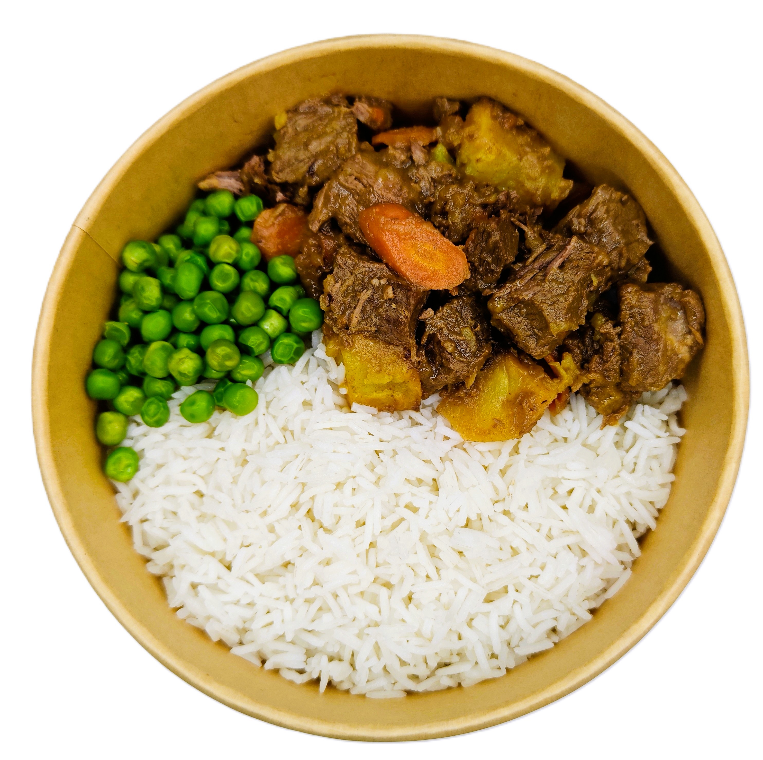 Bocconcini di manzo, patate, carote, piselli, riso basmati.