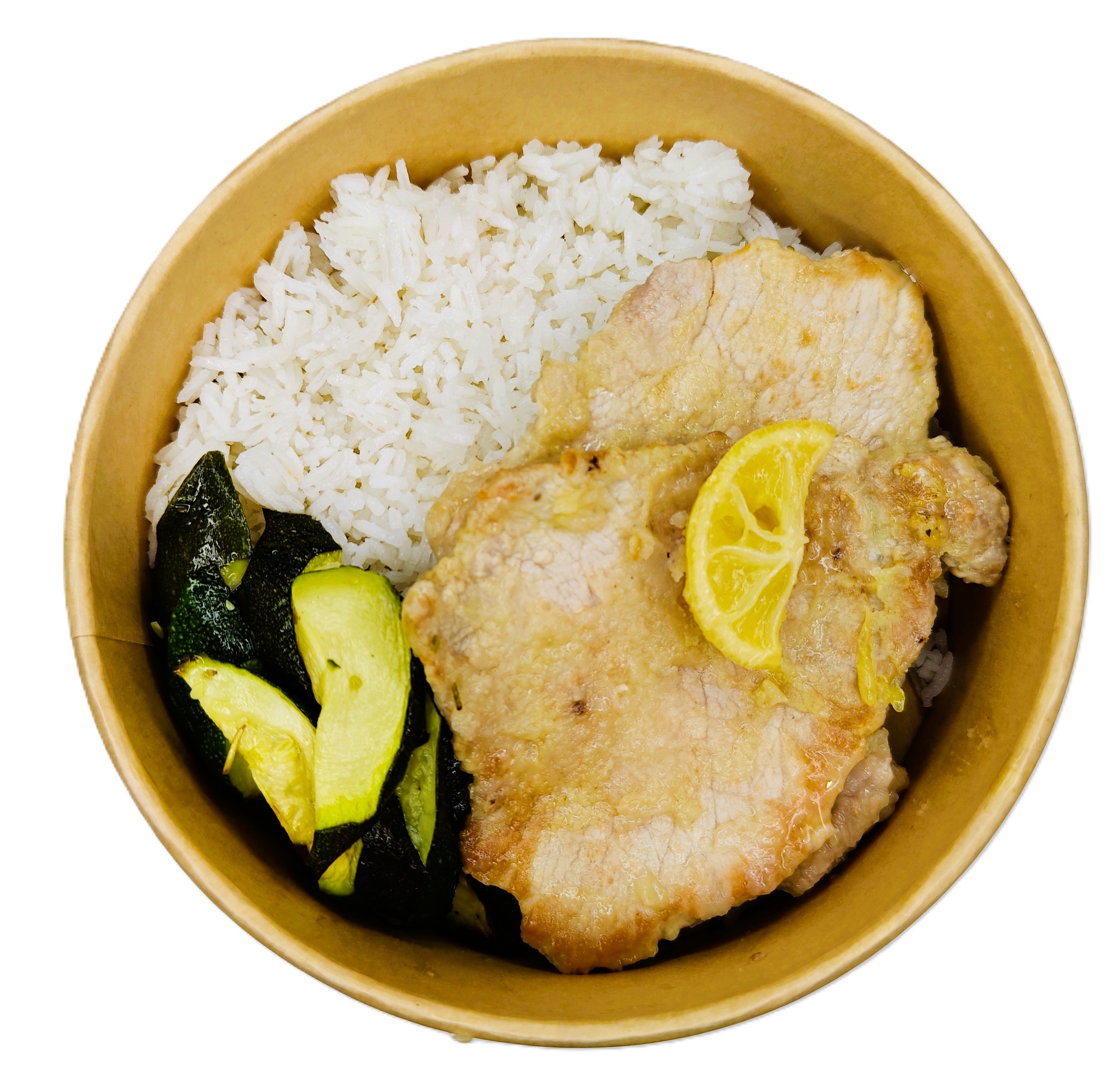 Lonza di maiale, limone, maizena, riso basmati, zucchine al forno.