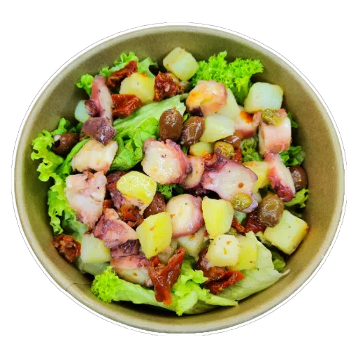 insalata gentile, rucola, polpo, salsa soia, pomodori secchi, capperi, olive, patate.
