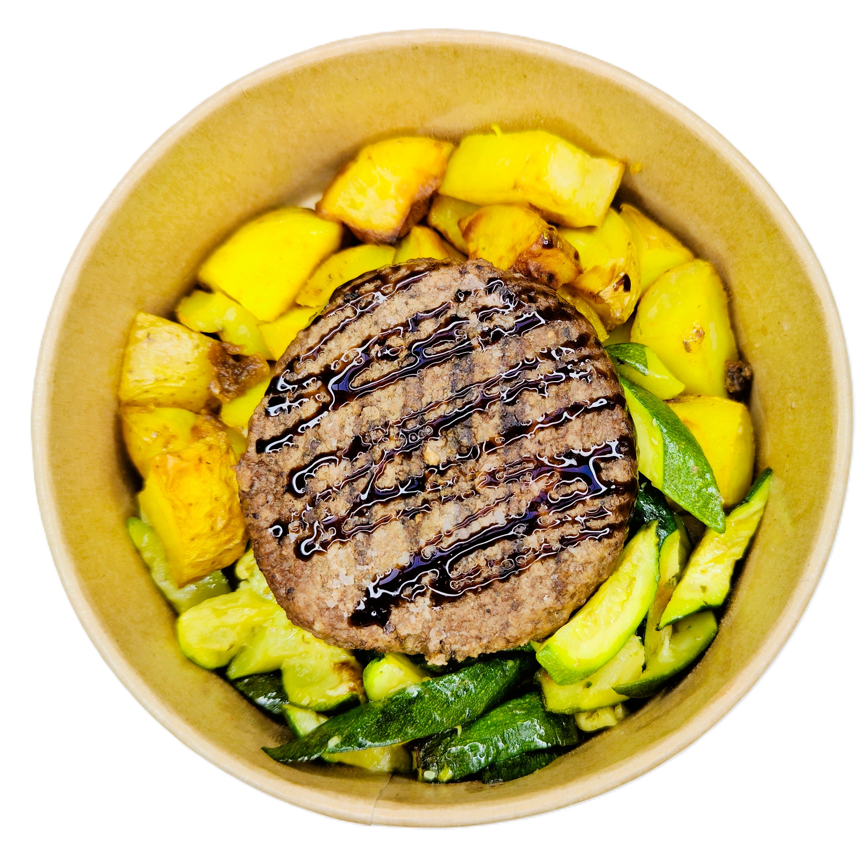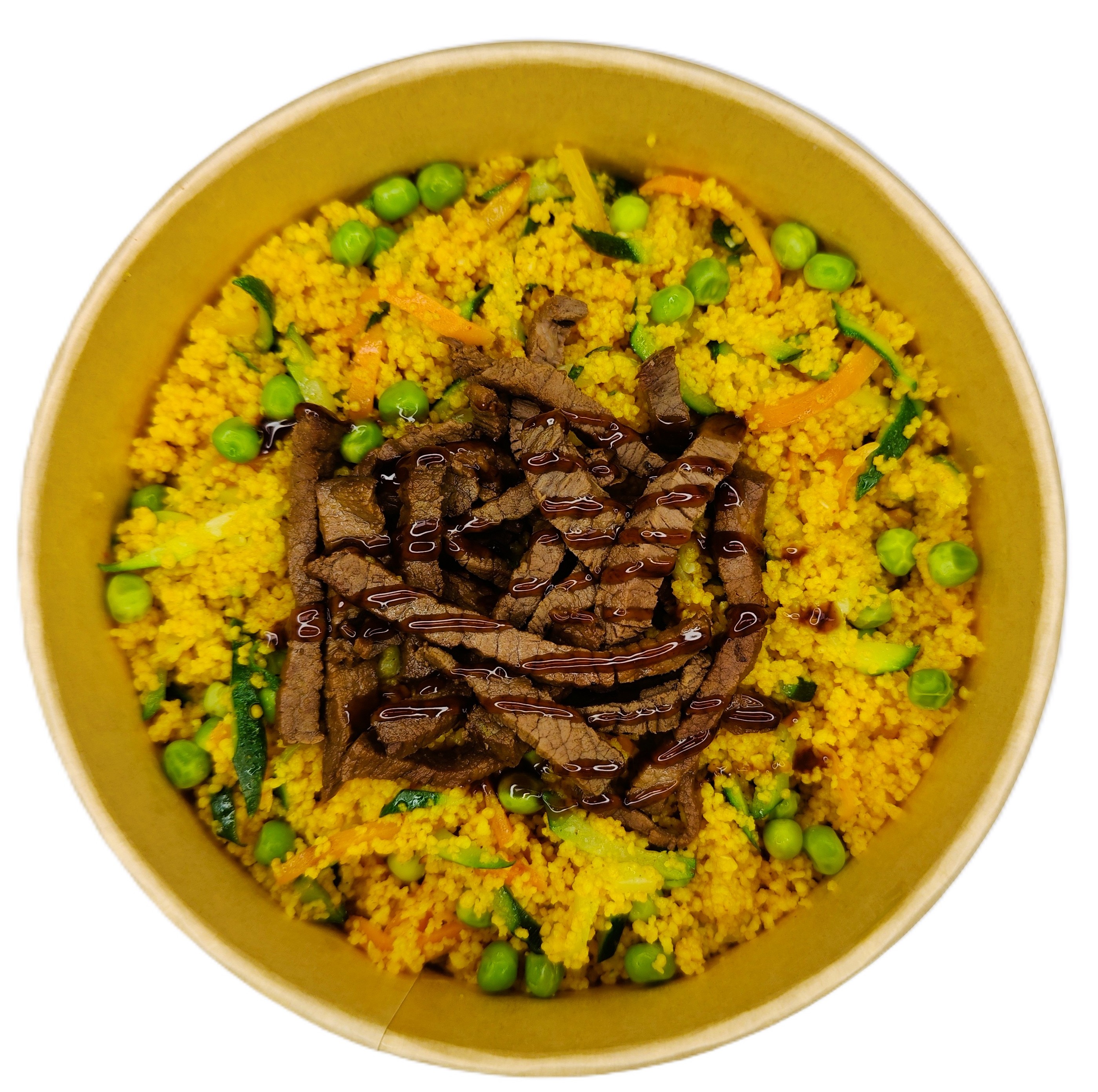 Cous cous, zucchine, peperoni, carote, piselli, manzo, teriyaki.