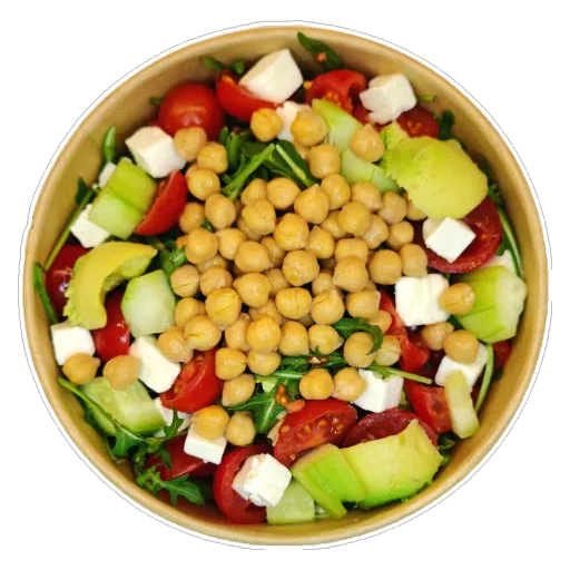 Insalata gentile, Rucola, Avocado,Cetrioli, Pomodorini, Feta greca, Ceci e Cipolla Croccante.