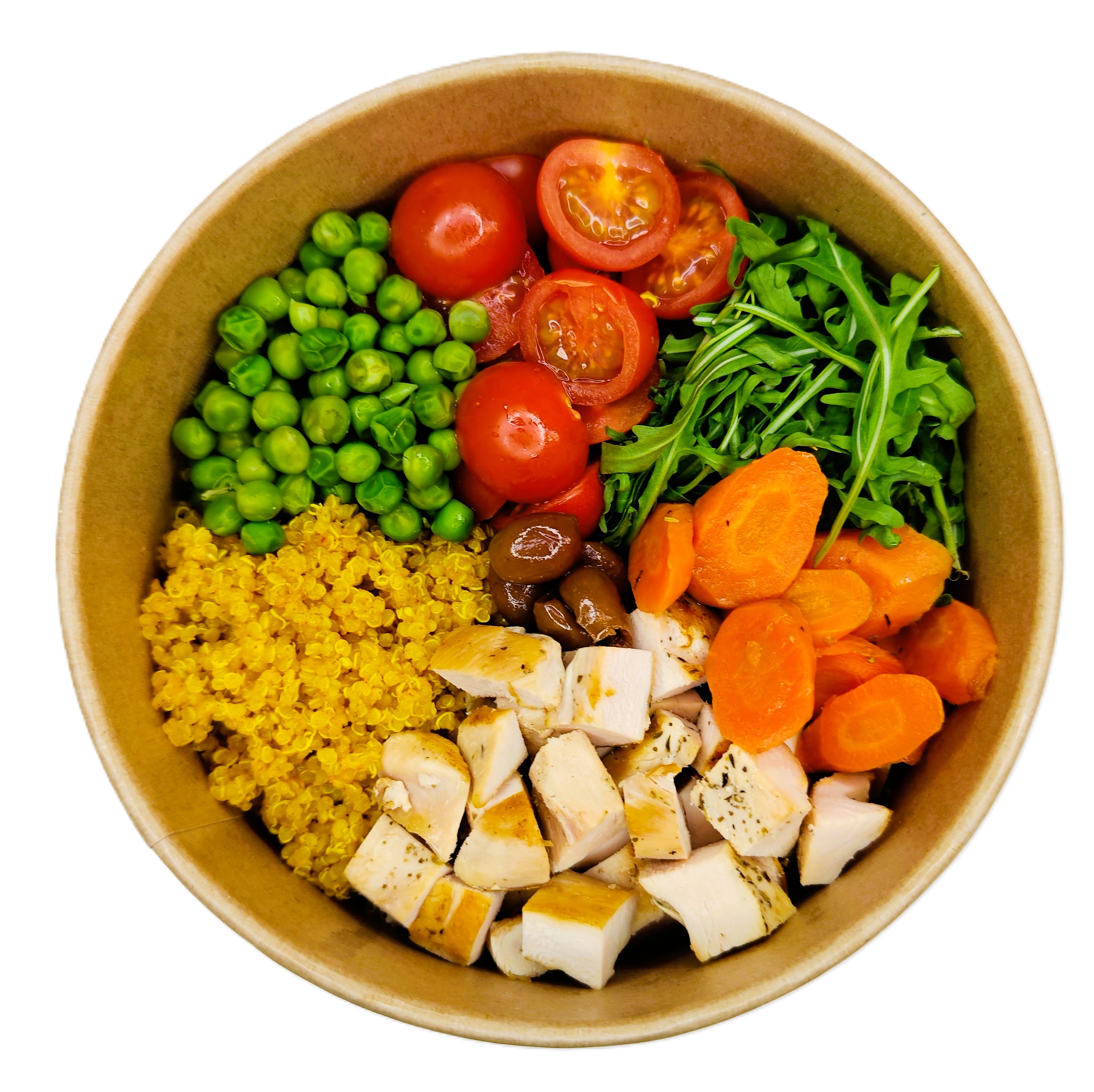 Quinoa, Pollo, Pomodorini, Piselli, Rucola, Olive, Carote.